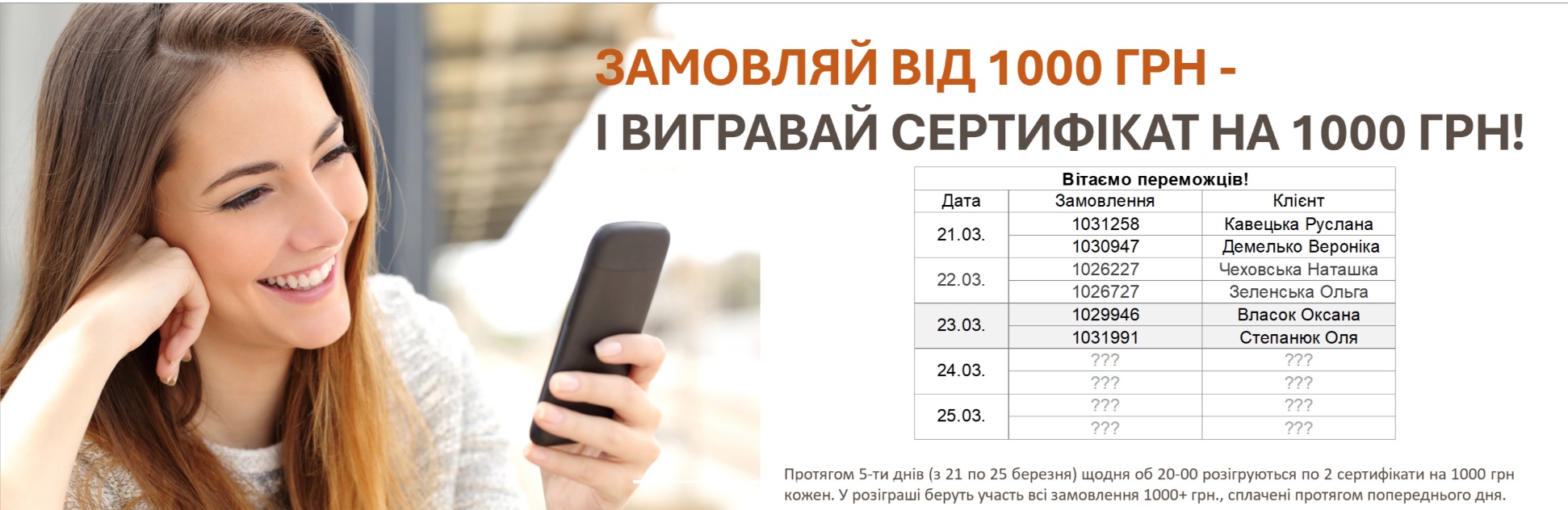 Упродовж наступних 5-ти днів ми розігруємо по 2 сертифікати на 1000 грн за всі замовлення від 1000+ грн, сплачені попереднього дня.