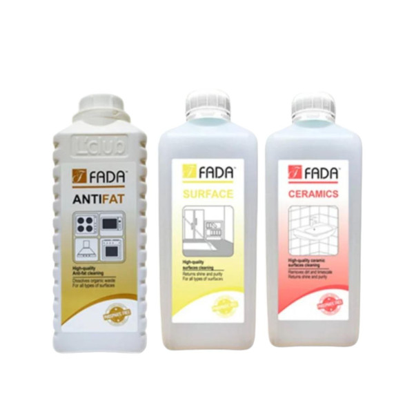 Фада Антижир 1 літр – Повністю готовий до застосування професійний засіб для ефективного чищення від жиру будь-яких поверхонь (духовки, грилі, мікрохвильові печі, витяжки, плити з нержавіючої сталі тощо). Швидко розчиняє органічні речовини (жир, залишки їжі), усуває навіть застарілий жир та нагар. Економний у використанні. Екологічно безпечний: не містить фосфатів та інших шкідливих речовин.